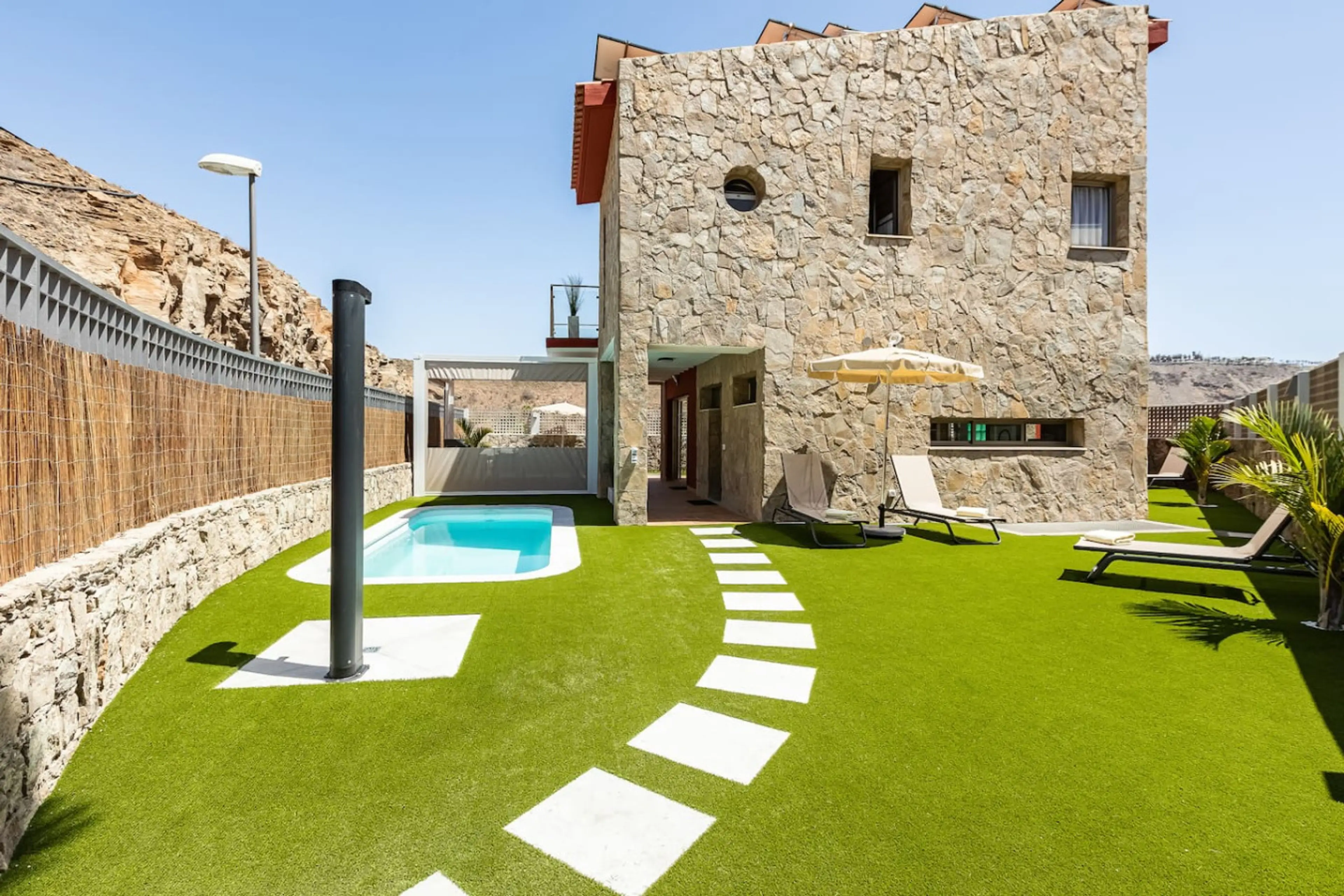 VILLA DE LUJO RECIEN REFORMADA INTEGRAMENTE!!! Es perfecta para unas vacaciones en familia en Gran Canaria! Decoración contemporánea, jardín con piscina privada climatizada y sol todo el día. Por la noche también puedes disfrutar del espacio al aire libre con su BBQ. Ubicada en una zona muy tranquil...